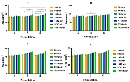 Area variation of CHT/VCO-based emulsion film samples loaded with CHT/POM capsules with and without curcumin in different pH media, pH 5 buffer (A,B), and PBS (C,D). Significant differences were assigned with ***, ** and * respectively for p < 0.001, p < 0.01 and p < 0.05.
