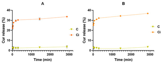CHT/VCO-based emulsion systems were included in the system to act as physical support for capsule dispersion. This approach will enhance the system’s potential for further topical application on the damaged skin surface, playing an active role in the healing process due to its intrinsic properties. As previously studied, CHT/VCO-based emulsions are viscous solutions with a non-Newtonian behavior [27], supporting the dispersion of CUR-loaded capsules, without compromising its film-forming ability. After casting into molds, the solutions were dried at 37 °C for 48 h, generating emulsion films with 0.30 ± 0.02 mm of thickness with good stability, handling ability, and flexibility. SEM images of the non-loaded and capsule-loaded films are presented in Figure 3 of the supplementary information. Figure S3B, suggests that the capsules incorporated into the film can cluster together with the oil droplets, making it difficult to see their distribution within the film. The observed droplets at CHT/VCO films surface are similar to earlier reported data [27], where the oil droplets at the films surface present a high heterogeneity of sizes, with a mean value of 10.8 ± 4.6 μm, which are in accordance with the presented data. Moreover, it is important to note that a notable increase in the film’s surface roughness was observed for the capsules loaded films compared to the non-loaded ones (Figure S3A), which may suggest the confirmation of the capsule’s presence within the film structure.