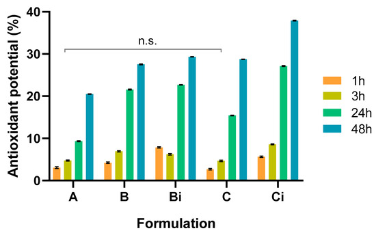 Damage to DNA, proteins, and lipids is due to ROS generated under oxidative stress conditions. So, it is important to suppress ROS accumulation and augment antioxidant levels. The antioxidant potential of the system was screened through a DPPH assay (Figure 7). All the studied compositions present antioxidant activity, attributed to the presence of VCO in the film, POM at capsule composition, and CUR, the releasable drug [15,19,29,46,47]. Their synergistic effect increased the observed effect for the CHT/VCO film with CUR-loaded capsules after irradiation, which promoted the CUR release to the media. Still, it was possible to observe an increase of the antioxidant potential over time for all the formulations, with significant statistical differences, confirming the influence of the individual antioxidant activity of each intervenient, particularly by VCO, which is released without any stimuli requirement. Furthermore, an increase in the antioxidant activity for the empty irradiated capsules is observed.