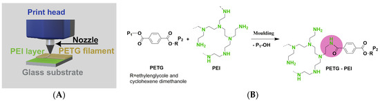 (A) Scheme of sample preparation by moulding. (B) Proposed grafting reaction of PEI onto PETG, whereby PEI is bound to PETG by an amide group (red circle). P1, P2 = residues of the PETG chain, R = ethyleneglycol and cyclohexene dimethanol.
