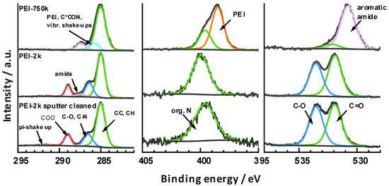 PEI-750k: The C1s line shape after modification with PEI-750k was totally changed and simplified to basically three chemical components at 285.0 eV (CC, CH) and 287.4 eV (aromatic amide). The third component was observed at 285.8 eV and only barely separated from the main peak. Owing to the low chemical shift, a range of assignments was possible including not only the amides C-N groups, but also vibrational shake-ups of C-H groups, the secondary carbon to the amide groups C*CON, and the CH2 groups of PEI. It was noted that the binding energies of the C1s and N1s signals of PEI are rather exotic and commonly found at 285.5 and 399.0 eV. However, the C1s clearly showed a quantitative transformation of all ester groups into amides within the complete depth of information, which was around 10 nm.