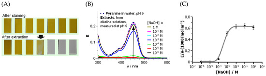 In the following experiments, the staining-extraction experiments were carried out with alkali solutions of different extraction concentrations. Since desorption of pyranine was only effective above a NaOH concentration of 10−2 M, only the concentrations of 10−2, 10−1, and 1 M were used.