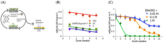 The grafting procedure was carried out with PEI-750k, PEI-25k, and PEI-2k. The amount of adsorbed pyranine was measured by extraction in 10−2 M NaOH solution, as described in the previous section. However, samples were re-stained after pyranine extraction here, and the amount of adsorbed pyranine in the next cycle was measured again in the extract. Those staining-extraction cycles (see Figure 4A) were repeated several times.
