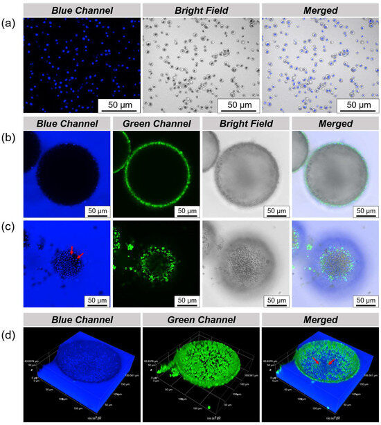 In order to more clearly observe and analyze the state of the Chlorella cells in the droplet microchamber, CLSM was used to characterize it. Chlorella cells can still emit blue fluorescence without the use of fluorescent labels in order to be easily distinguished from the proteinaceous microspheres labeled by FITC, as shown in Figure 4a. After emulsification, Chlorella cells can be encapsulated inside the droplet, using a perylene-labeled oil phase, and the state of the Chlorella cells inside the droplet can be clearly seen by CLSM. It is worth noting that at the cross-sectional focus of the droplet, only the adsorption of proteinaceous microspheres emitting green fluorescence on the interface can be presented, and the presence of Chlorella cells is not observed (Figure 4b). However, from the image of the bottom focus, it can be observed that the Chlorella cells are completely sedimented at the bottom of the droplet, as indicated by the red arrow (Figure 4c). As shown in Figure 4d, by 3D scanning the droplet, we can understand this phenomenon more intuitively and three-dimensionally. The reason that Chlorella cells sediment to the bottom of the droplets is obvious due to the effect of gravity.