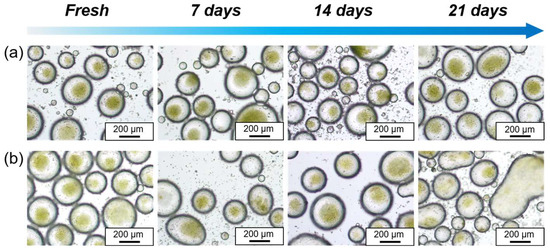 It is noteworthy that the emulsion under refrigerated conditions maintained great stability even after 21 days, showing no apparent demulsification, leakage of microalgae, or significant change in droplet size (Figure 5a). Typically, the original algae suspension is stored under refrigeration to ensure the maximum viability of the microalgae when in use. Therefore, the emulsion compartment system can serve as a novel and stable platform for the long-term storage of microalgae, particularly when refrigerated.