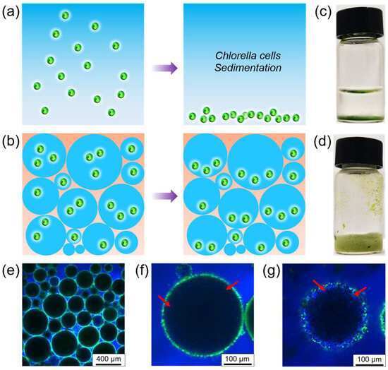(a) Schematic illustration of the sedimentation of Chlorella cells in water; (b) schematic representation of the sedimentation of Chlorella cells within the water-in-oil high-internal-phase Pickering emulsion droplets; (c) photo of the suspension of Chlorella cells after 4 days; (d) photo of the water-in-oil high-internal-phase Pickering emulsion encapsulating Chlorella cells after 4 days; (e) CLSM image of the water-in-oil high internal phase Pickering emulsion encapsulating Chlorella cells, in which proteinaceous microspheres and oil phase were separately labeled with FITC and perylene; CLSM images of (f) cross-sectional focus and (g) bottom focus of a single droplet with high-internal-phase Pickering emulsion. Among them, Chlorella cells are highlighted by red arrows.