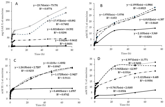 Evaluation of radical scavenging activity the aqueous phase of oil-in-water (O/W) emulsions. Control (●): emulsion only; Control+ (●): emulsion with Gallic acid; Film (●): emulsion with alginate film made from alginate and 60% ethanolic extract of M. communis L.; Infusion 1.0 mL (●): emulsion incorporated with 1 mL of the 60% ethanolic extract of M. communis L.; Infusion 1.5 mL (●): emulsion incorporated with 1.5 mL of the 60% ethanolic extract of M. communis L.; (●): emulsion with sphere made from 60% ethanolic extract of M. communis L. (A): DPPH, (B): FRAP, (C): ABTS, (D): Total Phenolic Compounds; TE: Trolox equivalent; GAE: gallic acid equivalent.