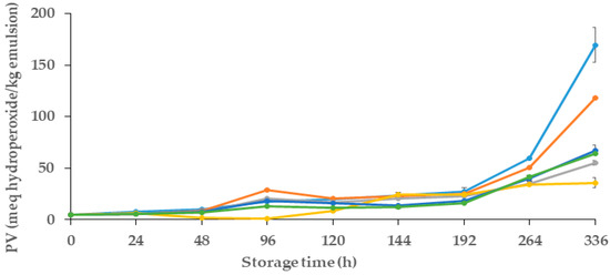 Figure 3 presents the evolution of the peroxide value of samples over their storage period. For all samples, in the initial 48 h, PV was similar (p > 0.05) and remained consistently low, with values less than ~10 meq hydroperoxides/kg of emulsion. After that, between 48 and 192 h (8 days), a gradual increase in the PV was observed in all emulsions, which presented significant differences in some storage points (p < 0.05). As observed, both control samples (control− and control+) showed the highest amount of PV after 8 days of storage (with 27.16 and 25.32 meq hydroperoxides/kg emulsion, respectively). After 14 days of storage (336 h), and as expected, the control− showed a lower oxidative stability than the control+, which could be attributed to the presence of gallic acid in the control+, which reduced the adverse primary oxidative reactions in that sample.