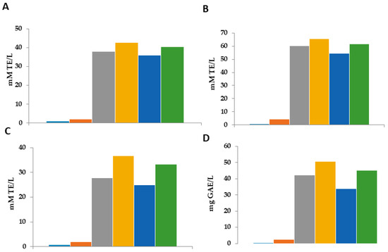 All the reagents were acquired from Sigma-Aldrich Química S.A. (Madrid, Spain). Anhydrous sodium carbonate (Na2CO3), Folin–Ciocalteu reagent, DPPH (2,2-diphenyl-1-picrylhydrazyl), methanol (CH3-OH), ethanol (C2H5OH), glacial acetic acid (CH3-COOH), aluminum trichloride hexahydrate (AlCl3·6H2O), sodium acetate trihydrate (CH3COONa·3H2O), hydrochloric acid 37% (HCl), iron chloride (III) hexahydrate (FeCl3 6H2O, TPTZ (2,4,6-tripyridyl-s-triazine), ABTS (2,2-Azino-bis(3-ethylbenzothiazoline-6-sulfonic acid), potassium persulfate (K2S2O8), PBS (phosphate-buffered saline), AAPH (2,2-Azobis(2-methylpropionamidine) dihidrochloride 97%)), fluorescein sodium salt (C20H10O5Na2), Trolox 97% (6-hydroxy-2,5,7,8-tetramethylchroman-2-carbonsaeure 97%), Tween-20, methyl linoleate (C19H34O2), iron (II) chloride (FeCl2), and ammonium thiocyanate (NH4SCN).
