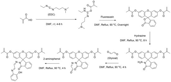 As illustrated in Figure 1, first, 33.79 µL of MAA and 68.36 mg of EDC were added to 5 mL of DMF in a 10 mL round-bottom flask. The solution was then stirred at room temperature for 4–6 h. A sample of 66.5 mg of fluorescein was then added to the solution, and the solution was refluxed at 90 °C overnight while stirring. The solution was then added to 100 mL of deionized water in a 250 mL beaker, and the beaker was placed into an ice bath for 8 h. The solution was then centrifuged for 10 min at 5000 rpm, and the resulting solution was decanted to obtain a solid product. This product was then redispersed in 5 mL of DMF in a 10 mL round-bottom flask, and 64.1 µL of 35 wt% hydrazine solution was added. The solution was then refluxed at 90 °C overnight while stirring. The solution was then dried using a rotary evaporator to remove excess hydrazine solution, and the solid product was redissolved in 5 mL of DMF. A total of 91.5 µL of 40 wt.% glyoxal solution was then added, and the solution was refluxed at 90 °C for 4 h with stirring. The solution was then dried again using a rotary evaporator to remove excess glyoxal solution, and the solid product was redissolved in 5 mL of DMF. Then, 21.84 mg of 2-aminophenol was added, and the solution was refluxed at 90 °C for 4 h with stirring. The solution was then dried using a rotary evaporator, and the resulting solid product was redissolved in 5 mL of methanol for use in the IIP polymerization step.