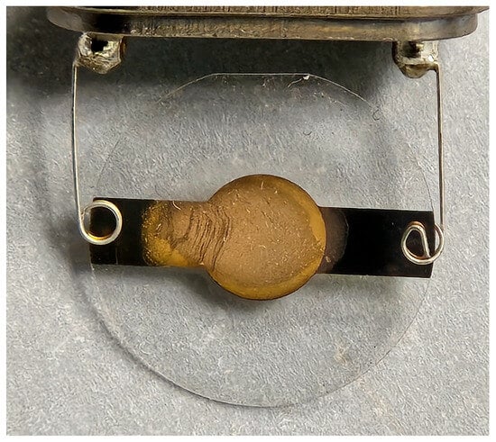 The QCM chips used in this work were 10 MHz, 14 mm gold crystal chips obtained from RenLux Crystal Ltd., in Shenzhen, China. First, a new QCM sensor chip was wiped clean with a small amount of ethanol, and 9.6 µL of IIP solution was then extracted and slowly coated onto the QCM chip in a circular motion. The freshly coated chip was then left to dry in air at room temperature for about 2 h before the sensing chip (Figure 2) was ready for use.