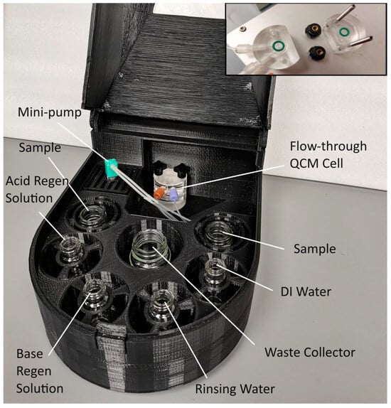 The assembled flow cell was then placed into one of the flow cell holders in the QCM instrument. The inlet capillary tube and outlet capillary tube were then connected to the flow cell, with the inlet being placed in one of the beakers containing deionized water.