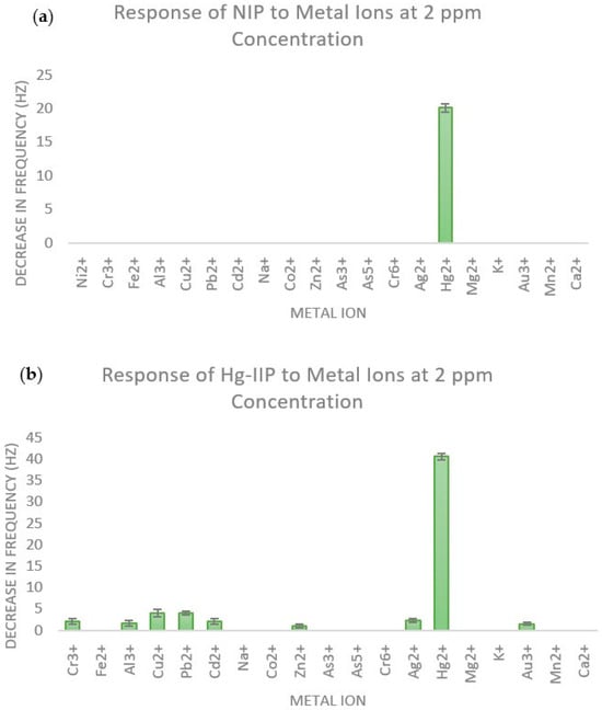 Comparison of the response to metal ions at 2 ppm concentration for (a) NIP and (b) Hg-IIP.