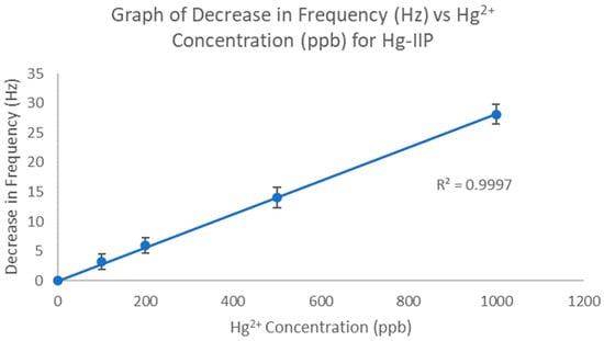 The LOD and LOQ of the Hg-IIP-QCM method were calculated to be 14.17 ppb and 42.94 ppb, respectively. The WHO guideline value for inorganic mercury in drinking water is 6 ppb []. As such, this means that the Hg-IIP-QCM method would not be able to detect nor quantify mercury concentrations around the WHO guideline value. For the Hg-IIP-QCM method to be able to detect mercury concentrations around that value, further improvements to the sensitivity of the IIP to mercury would be needed. Nevertheless, the Hg-IIP-QCM method would still be useful in applications dealing with larger concentrations of mercury, such as the treatment of mercury-contaminated wastewater. The S/N of 4.29, while not extremely high, is high enough that the signal can be accurately distinguished from noise, as, generally, signals are indistinguishable at S/Ns below 2 to 3. The working range of the sensor was established to be from 42.94 ppb (the LOQ) to 2 ppm, above which the relationship between the increase in Hg2+ concentration and decrease in frequency was no longer linear.