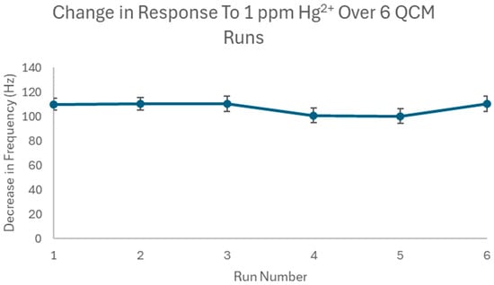 According to Figure 6, the response remained relatively constant over the six runs, with a slight decrease in runs 4 and 5, likely from instrumental fluctuations. The %RSD of the six runs was calculated to be 4.84%, indicating that there was little variation in the response. As such, the repeatability of the Hg-IIP-QCM method is relatively good.