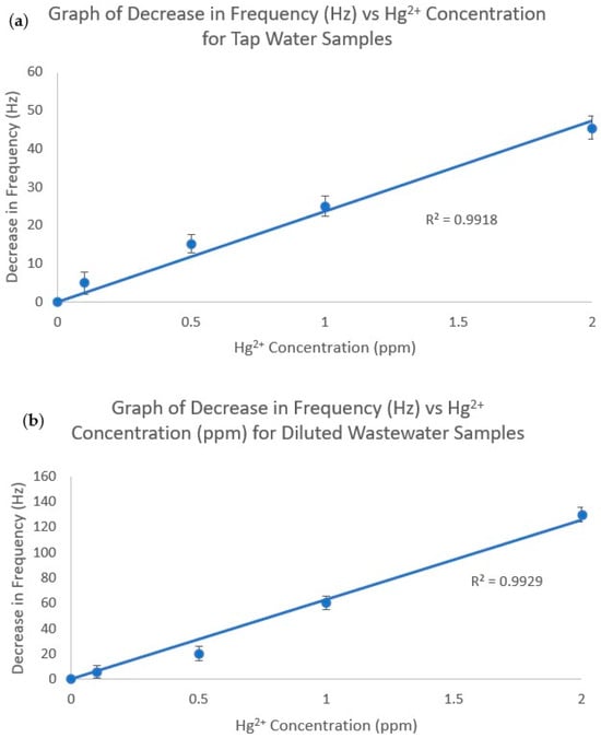 Decrease in frequency vs. Hg2+ concentration for (a) tap water samples and (b) diluted wastewater samples.