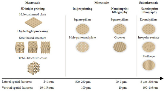 The aim of this study was to apply a thiol-ene resin across three industrially significant technologies capable of processing photocurable resins for prototyping bioinspired scaffolds: namely vat polymerisation and especially by adding 3D inkjet printing and NIL to the existing portfolio of processing technologies for VEs. A comparative evaluation of selected bioinspired scaffolds revealed that structures over a span of six orders of magnitude, starting from the macroscale (<10 mm), moving into the microscale (<500 µm), and reaching the submicroscale (<150 nm), were successfully fabricated.