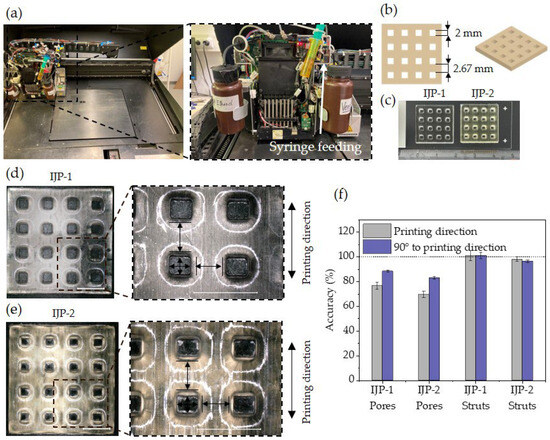 A noteworthy aspect of our work is that we are uniquely equipped to have an open access Connex platform to study our resin. Syringe feeding, as presented in Figure 2a, was employed, allowing for the direct supply of material to the printheads. This method enabled the evaluation of experimental materials in small quantities, thereby exploring new possibilities for testing inks using PolyJetTM technology. Two quadratic mono-material hole-patterned plate models with a side length of 20 × 20 mm2 were printed, each with a pore size of 2 mm and strut size of 2.67 mm (Figure 2b). The models, intended as a prestage for lattice structures, differed in height (): model IJP-1 with = 1.5 mm and model IJP-2 with = 4 mm. Due to the challenge of printing overhanging structures without support material with this technology, we focused on these models to demonstrate printability.