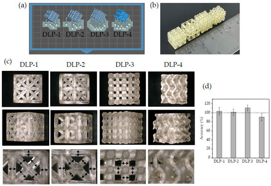 Lattice structures, which are porous architectures composed of periodic arrangement of unit cells, are excellent candidates for scaffold fabrication [49]. Four models with pore and strut sizes ranging from 1 mm to 1.5 mm were selected, including strut-based structures like face-centred (DLP-1), body-centred (DLP-2), fractal cubic simple (DLP-3) and triply periodic minimal surface (TPMS) (DLP-4) lattices, see Figure 3. To print internal support-free structures, each part was tilted by 45° in both the X and Y directions, Figure 3a. Selected models were successfully printed (Figure 3b,c) using the resin. To determine accuracy of the printing, strut dimensions of the different lattices were measured and compared with designs, Figure 3d. Face- and body-centred lattices exhibited slight deviations of 3% and 1% with respect to the design. Cubic simple and gyroid lattices also displayed minor deviations from the intended design, with a measured 10% mismatch in strut size.