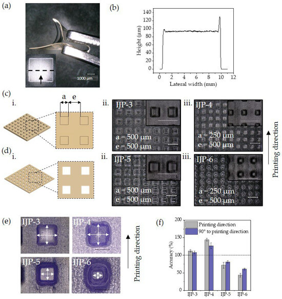 Micropillars were successfully printed with two different side lengths (), IJP-3 ( = 500 µm) and IJP-4 ( = 250 µm) and are depicted in Figure 4c (ii,iii). Accuracy analysis was performed by comparing the side length (a) with the designs, as presented in the graph in Figure 4f. The measurement position is indicated in Figure 4e. A loss of fidelity was found and as expected, this deviation was more dominant for smaller pillars. A more pronounced mismatch occurred in the printing direction with a deviation of 12% for 500 µm square pillars (IJP-3) and 44% for 250 µm square pillars (IJP-4). Perpendicular to the printing direction, the deviations were 8% for 500 µm pillars and 27% for 250 µm pillars.