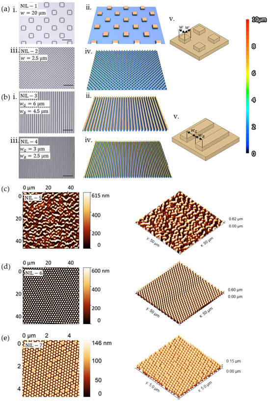 Bioinspired micro and submicroscale structures fabricated via NIL. Topography imaged via laser scanning microscopy for arrays of: (a) (i,ii) square pillars (NIL-1). (iii,iv) Square pillars (NIL-2). (v) Design dimensions for pillars; (b) (i,ii) Grooves (NIL-3). (iii,iv) Grooves (NIL-4). (v) Design dimensions for grooves. Top view scale bar: 50 µm. Colour scale applies to all images; Top and tilted (45°) topographic AFM images for arrays of: (c) irregular surfaces; (d) circular pillars; (e) moth eye.