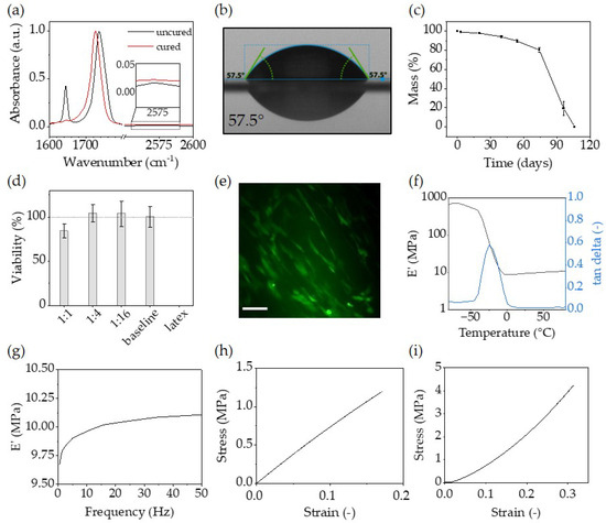 (a) FTIR spectrum of the uncured and cured thiol-ene resin with characteristic bands for the vinyl double bond at 1645 cm−1, the carbonyl bond at 1700 cm−1, and the S-H bond at 2570 cm−1; (b) water contact angle; (c) mass loss of the bulk material at 37.4 °C in percent of initial mass at pH 10; (d) CCK-8 viability assay of BMSCs (n = 3) with different dilutions of the material eluate, the baseline (100%) and latex eluate; (e) live/dead fluorescence microscopy image of viable BMSCs (green) grown for 72 h on the material surface. Scale bar: 100 µm; (f) storage modulus and tan delta from DMA measurement at 1 Hz; (g) DMA frequency sweep at 35 °C; (h) tensile measurement at a rate of 0.1 mm/s; (i) compression measurement at 0.1 mm/s.