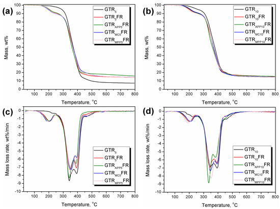 Plots of (a,b) mass loss curves and (c,d) differential thermogravimetric curves for PU/GTR composite foams.
