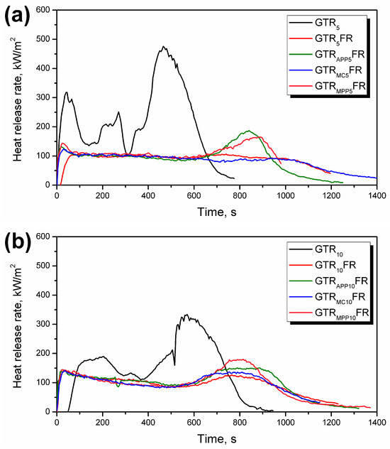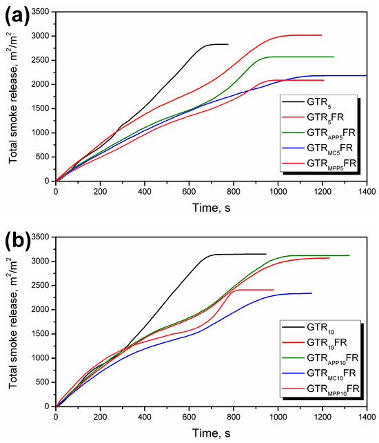 A detailed analysis shows that samples containing modified GTR differed more obviously in terms of HRR parameters. MARHE is deduced from the maximum HRR, and in some cases, including the deformation of samples, determining an appropriate value of the index may be problematic [92]. The THR corresponding to the total heat output up to the defined point for GTR5 and GTR10 was 167 MJ/m2 and 150 MJ/m2, respectively. The reduction for all investigated samples, from 22 to 36%, may follow from char forming or reduced combustion efficiency [104]. Since the EHC was reduced from 22 MJ/kg (GTR5) to 17 MJ/kg (GTR5FR and GTRAPP5FR), both mechanisms of action are possible.