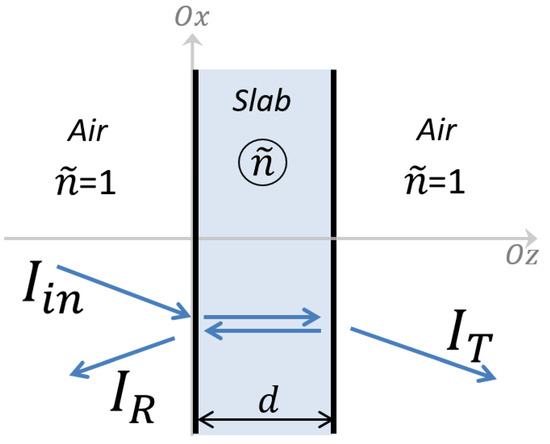 Schematic representation of the interaction of optical waves due to the slab material (with a complex refractive index, ) in air.