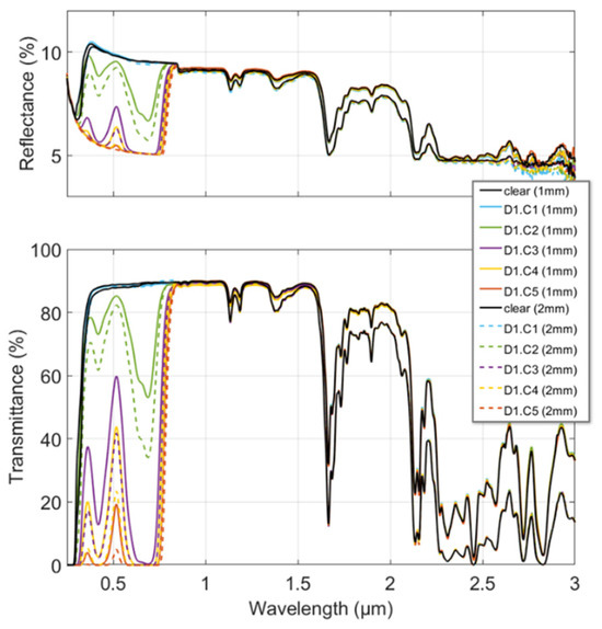 Reflectance and transmittance spectra measured from 0.3 to 3 µm for the polycarbonate doped with Dye 1 (D1) at the different concentrations and thicknesses of the samples. A color is assigned to each concentration (C1 to C5); solid lines are used for 1 mm thick samples and dashed lines for 2 mm thick ones.
