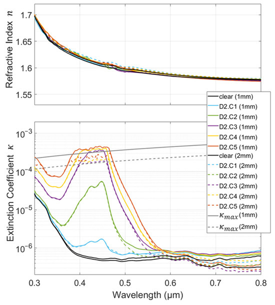 Refractive index, n, and extinction coefficient, κ, calculated from 0.3 to 0.8 µm for polycarbonate doped with Dye 2 (D2) at the different concentrations and thicknesses of the samples. A color is assigned to each concentration (C1 to C5); solid lines are used for 1 mm thick samples and dashed lines for 2 mm thick ones.