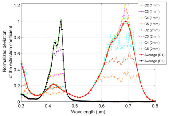 Normalized deviation of the extinction coefficient as a function from 0.3 to 0.8 µm at different dye concentrations of the samples. A color is assigned for each concentration (C2 to C5) and each thickness (1 and 2 mm) for both dyes (D1 and D2); solid lines with asterisk markers are used for 1 mm thick samples and dashed lines with diamond markers for 2 mm thick ones. The average values calculated are the spectral efficiencies of the dyes.