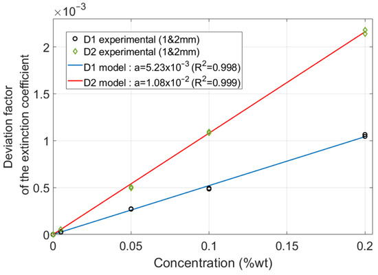 A linear model, , fits the values calculated over the whole concentration range (C1 to C5) for both dyes (D1 and D2) with good agreement. The intercept is set to zero to ensure that is also equal to zero for the clear material since there is no effect expected when there is no dye. This model, which includes the interface effects, is coherent with the Beer–Lambert law, which states, for each wavelength, that the absorptivity is proportional to the concentration [35,36].