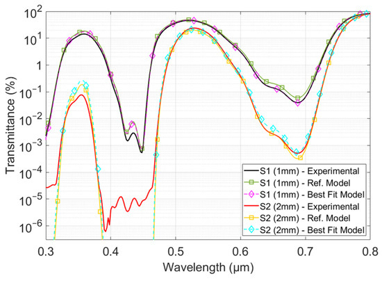 The concentration values were finally used to calculate the corresponding transmittances. Figure 7 compares the measured (experimental) and calculated (models) transmittances for one thickness of each sample. The calculations were carried out with the model presented using the reference concentration values provided by the manufacturer (Ref. model, straight line with square markers) or using the values obtained via numerical determination (Best fit model, dashed line with diamond markers).