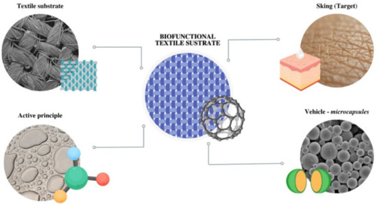 The fabrics used as a matrix (Figure 1) for the controlled release can be applied in many fields, from fashion to sportswear, cosmetics, protective clothing, and medical aid [2,3]. The potential techniques for incorporating active ingredients into fabrics are the application of microcapsules [4,5,6,7], cyclodextrins [8,9,10,11,12], liposomes [13,14,15], and metal–organic frameworks [16,17,18,19].