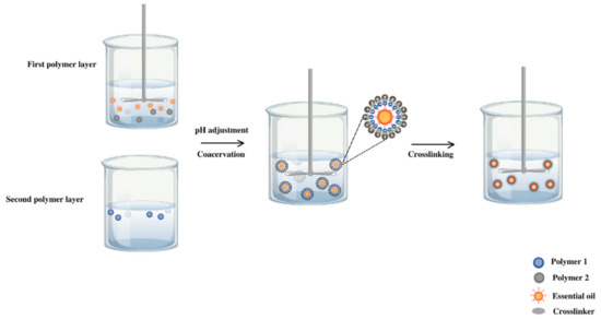 There are many combinations between processes and polymers via which it is possible to obtain microcapsules, each of which imparts properties to the shell, such as stiffness, porosity, resistance, and chemical affinity with the medium and/or active substance [22]. Techniques can include simple or complex coacervation, fluidization, lyophilization, and spray-drying used to improve the stability of the active ingredients. Complex coacervation has been increasingly used in the methods used to form microparticles due to its simplicity, low cost, scalability, and reproducibility in encapsulation [23,24].