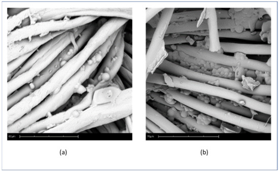 One can see the microcapsules of Citronella Oil on the surface of the fabric (Figure 3 (a) cotton and (b) polyester), and the microcapsules of Lavender Oil applied on the textile substrates (Figure 4 (a) Cotton and (b) PET). It can be seen that the morphology of the microcapsules on the surface is spherical and well-defined, and that they cover the fabric. The formation of small microcapsule agglomerates is due to the complex coacervation technique, as can also be seen in Bezerra’s work [6].