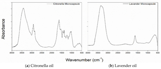 FTIR Spectra of microcapsules of (a) citronella oil and (b) lavender oil.