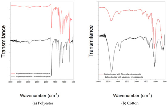 FTIR spectra of microcapsules applied to textile substrates by impregnation and Foulard: (a) polyester and (b) cotton.