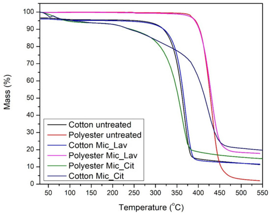 After these experimental results were obtained, it became clear that the influence of the textile substrate used is of crucial importance on the final behavior of the system on delivery of the essential oil introduced inside the fibers through microcapsules. The influence of the substrate is related, not only to the mutual chemical character of the shell structure of the microcapsule but also to the chemical characteristics of the components of the essential oil, versus the textile substrate. From Table 4, it is clear that, although the interaction between the external structures of the microcapsules were only interacted in cotton, the effect of polyester in the global transport coefficient is different attending the essential oil applied. Moreover, the effect of more uniform absorption of cotton substrates detected in TGA results (see Figure 6) is diluted when lavender oil is changed by citronella oil, using the same microcapsule structure.
