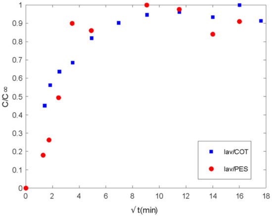 Delivery of lavender oil microencapsulated with chitosan–Arabic gum from PES and COT fabrics. Ct/Cinf vs. the square root of time (min1/2).