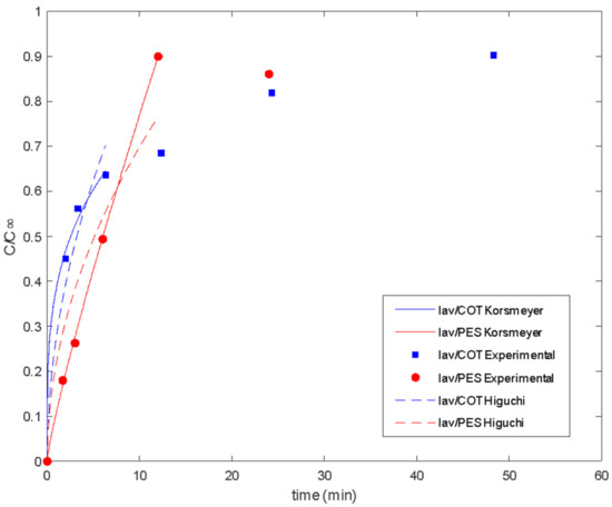 There are three main assumptions considered in the Korsmeyer–Peppas model: first, the general model is best suited for short times where C/C∞ < 0.6 in the release curve, which should be used for the determination of the exponent n; the ratio between the system length and thickness should be at least equal to 10 [54]. For the studied release systems, different maximum values for C/C∞ were considered in the model fitting (Figure 11). So, it was shown that lavender oil presented good fitting until values of 0.64 and 0.90 when using cotton and polyester fabrics, respectively. For citronella oil, the model was best suited for shorter times considering the release curves for C/C∞ < 0.4.