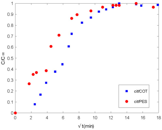 Delivery of citronella oil microencapsulated with chitosan-Arabic gum from PES and COT fabrics. Ct/Cinf vs. the square root of time (min).