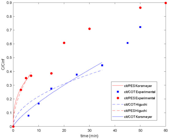 The Korsmeyer–Peppas model [54] and the Higuchi model were also fitted to the release data of citronella oil (Figure 10 and Table 3).
