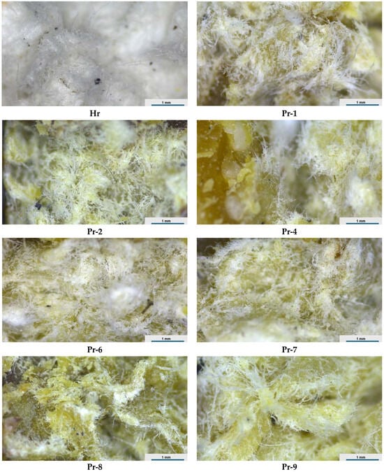 Samples Pr-1 to Pr-9 consisted of cellulosic pulp microfibers embedded with beeswax, fir resin, or their blends, along with different fillers. The integration of horsetail powder, rice flour, or ground fir needles with molten wax or resin imparts unique characteristics to each composite. For instance, samples with horsetail powder exhibit a more granular texture due to the incorporation of fine particles. The uniform distribution of these additives within the cellulosic matrix is crucial for enhancing the mechanical and thermal properties of the composites. The microscopy images illustrate this uniformity and hint at an effective bonding between the cellulosic fibers and added materials. This bonding is essential for achieving enhanced structural integrity and durability. Furthermore, it can be observed that there is a variation in color tones across different samples; this could be attributed to the natural pigments present in horsetail powder, rice flour, or fir needles. These variations not only contribute esthetically but may also influence properties like UV resistance.