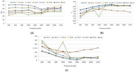 Average values of the selected materials in terms of acoustic performance: (a) sound transmission loss (TLn), (b) sound absorption coefficient, (c) sound reflection coefficient (Hr: paper pulp core; Pr: composites with paper core impregnated with the formulations from Table 1).