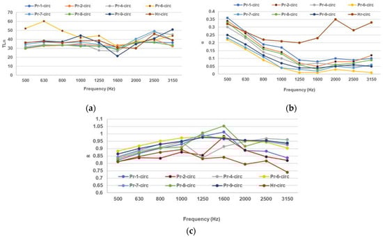 Acoustic measurements for the circular-patterned molded composites and paper pulp: (a) sound transmission loss (TLn), (b) sound absorption coefficient, (c) sound reflection coefficient.