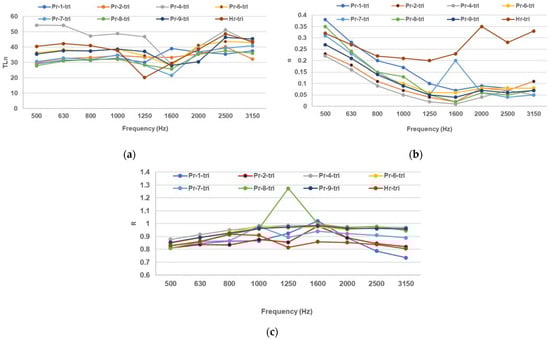 Acoustic measurements for the triangular-patterned molded composites and paper pulp: (a) sound transmission loss (TLn), (b) sound absorption coefficient, (c) sound reflection coefficient.