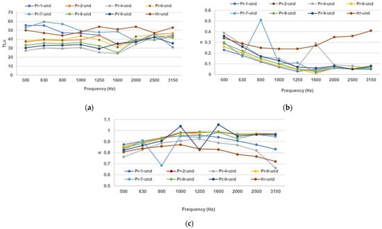 A high TLn means that the material can block most of the sound energy from passing through, which is desirable for sound insulation applications. It can be seen from Figure 6a that the best sound insulation character is registered for sample Pr-7-und, based on a paper core impregnated with beeswax and ground fir needles. However, a high TLn does not necessarily mean a high sound absorption coefficient (α) or a low sound reflection coefficient (R). These parameters measure the amount of sound energy that is absorbed or reflected by the material, respectively. A high α means that the material can reduce the noise level and improve the sound quality, which is desirable for sound absorption applications. A low R means that the material can avoid unwanted echo or noise, which is also desirable for sound absorption applications. Therefore, depending on the application, it may be better to have a high TLn, a high α, or a low R. For example, if the noise from outside sources needs to be reduced, a material with a high TLn is desired. For improvement in the acoustics of a room, a material with a high α and a low R might be more suitable.