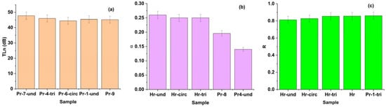 A higher TLn means a lower sound transmission and better sound insulation. All samples show an increase in TLn with frequency, which means they are more effective in blocking high-frequency sound waves (Figure 2a). All the composite samples have higher TLn than Hr, which means they have higher density and lower porosity than paper pulp. Among the Pr samples, Pr-7 (with fir needles and beeswax mixture) has the highest TLn, which means it could have the lowest air gap among the natural composites. The literature values of TLn for porous materials range from 10 dB to 40 dB, depending on the frequency, thickness, and density of the material. The Pr samples have similar or higher TLn than the literature values, which means they have comparable or better sound insulation performance than the usual insulation materials [].